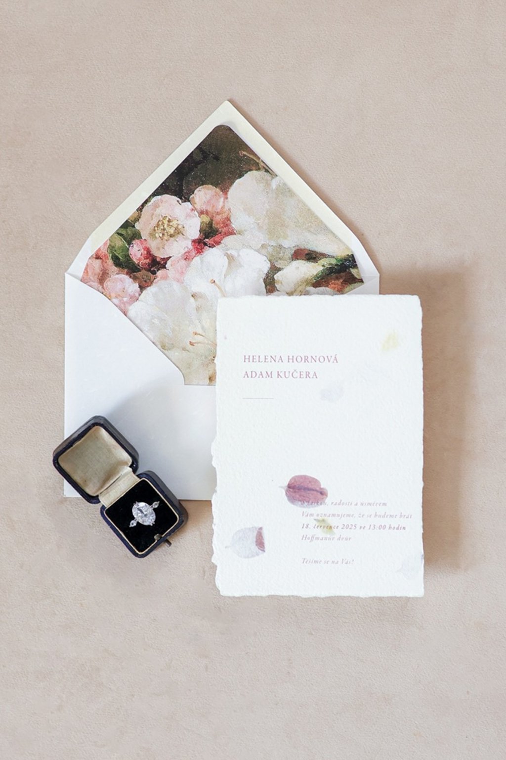Jemné svatební oznámení s lisovanými okvětními lístky. Limitovaná edice.