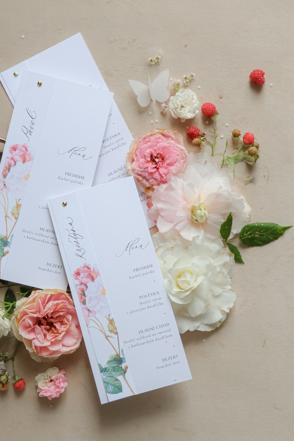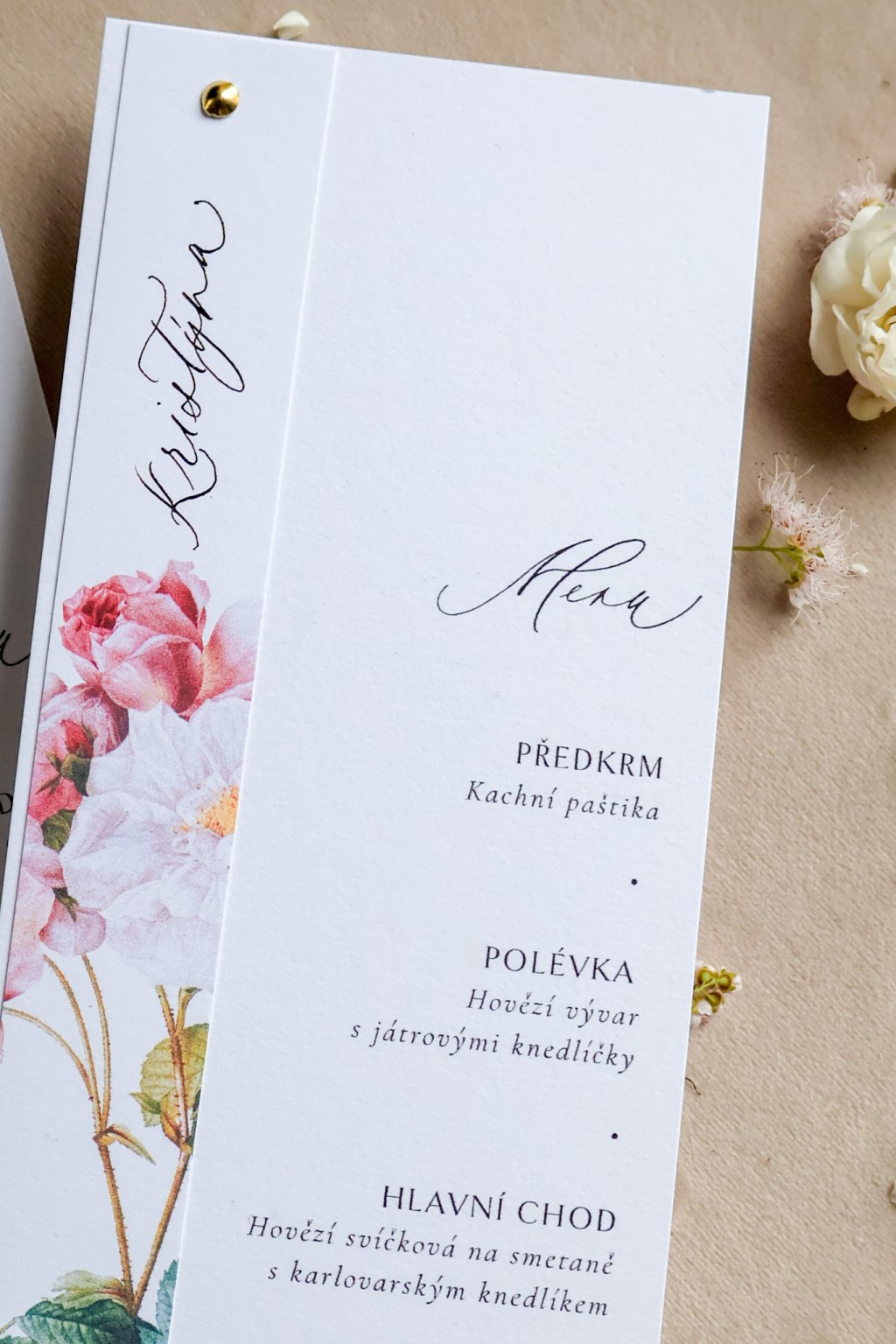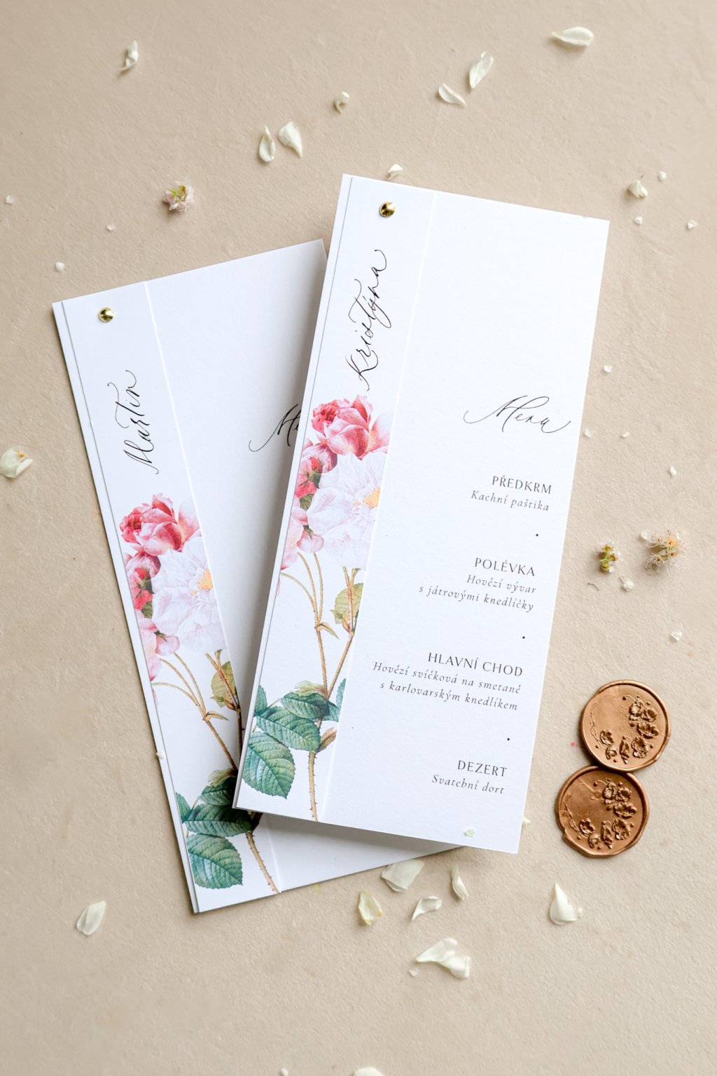 Luxusní svatební menu s jemnou ilustrací růží a ručně psanou jmenovkou, které doladí vaši svatební tabuli k dokonalosti.
