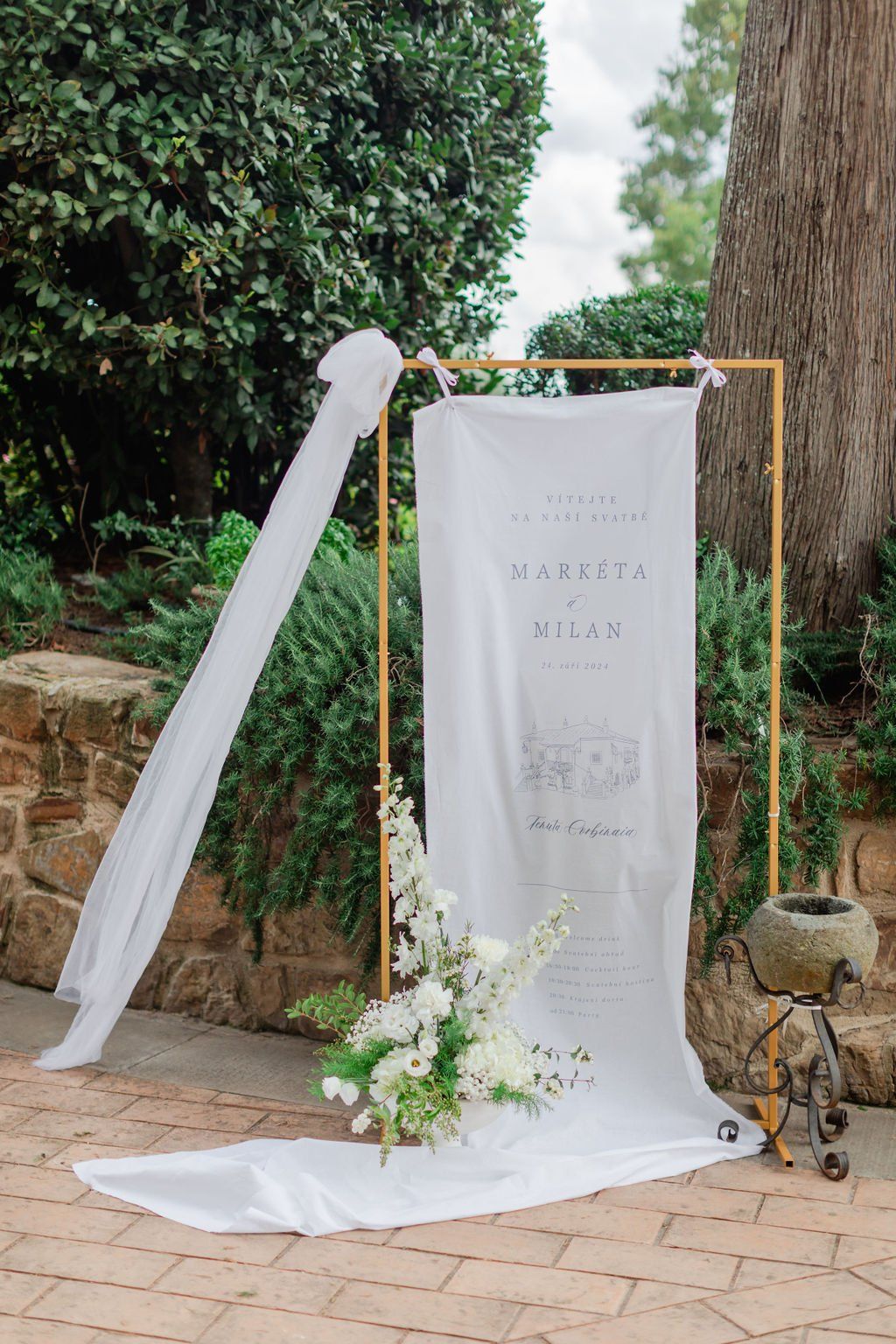 Stylová uvítací cedule z jemné bavlněné látky s kaligrafickým nebo tištěným nápisem. Elegantní doplněk svatební výzdoby laděný k vašim tiskovinám – krásný detail i památka na den D.