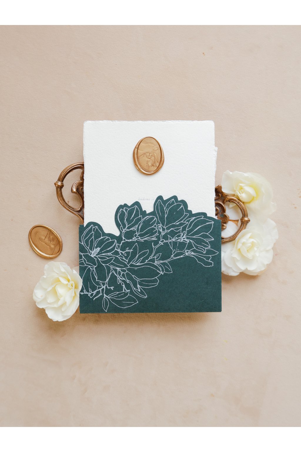 Doplňky: zlatá vosková pečeť, tmavě zelená květinová košilka s bílým tiskem